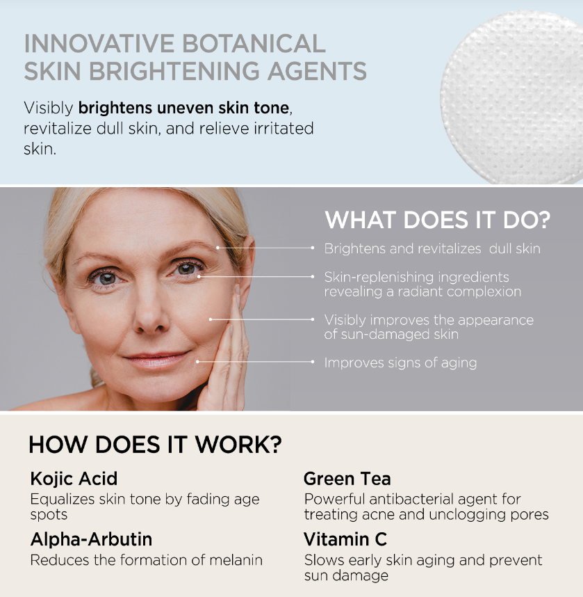 These advanced brightening pads are infused with botanical skin brighteners, powerful antioxidants, and soothing ingredients to restore radiance and even out skin tone.